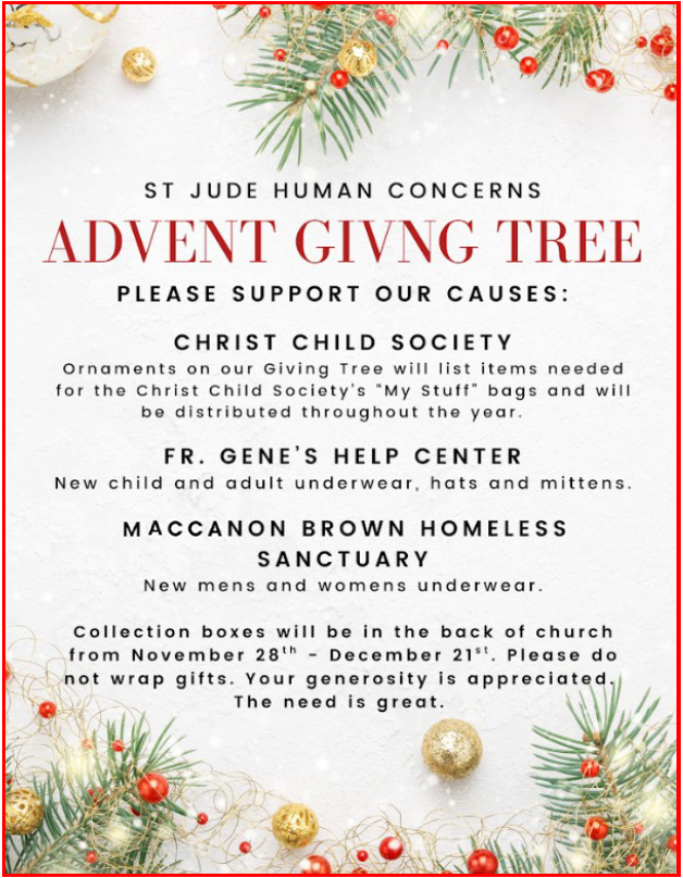 The Human Concerns committee is hosting a gift drive for children in need. There are Advent Giving Trees located at all the church entrances that have slips of paper listing out requested gifts. Please only take a slip if you plan to purchase a gift for the drive.